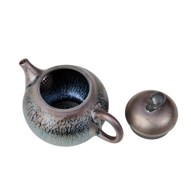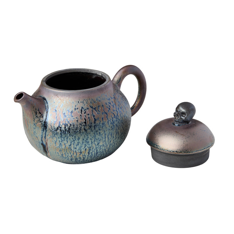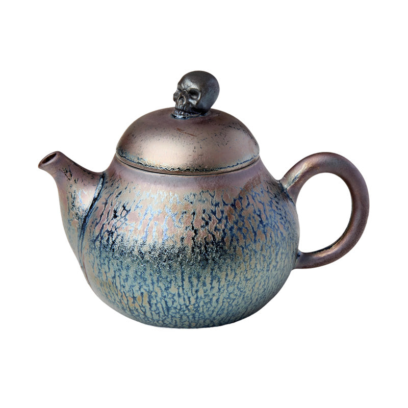 A glazed jianzhan (tenmoku) pear style teapot with a skull on the lid.