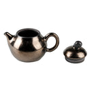 A glazed jianzhan (tenmoku) pear style teapot with a skull on the lid.
