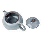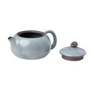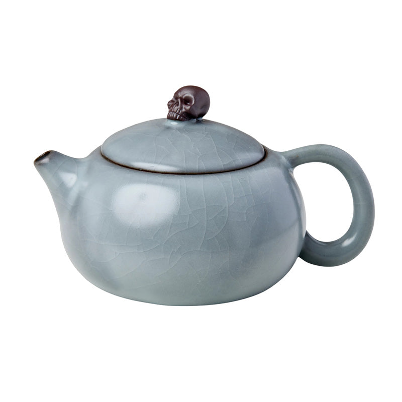 A glazed smoke gray xishi style ruyao teapot with a skull on the lid. This glaze is crackled and will leave a bit of crazed pattern with use.