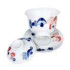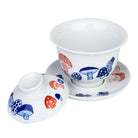 A gaiwan with a blue and red mushroom patch design.