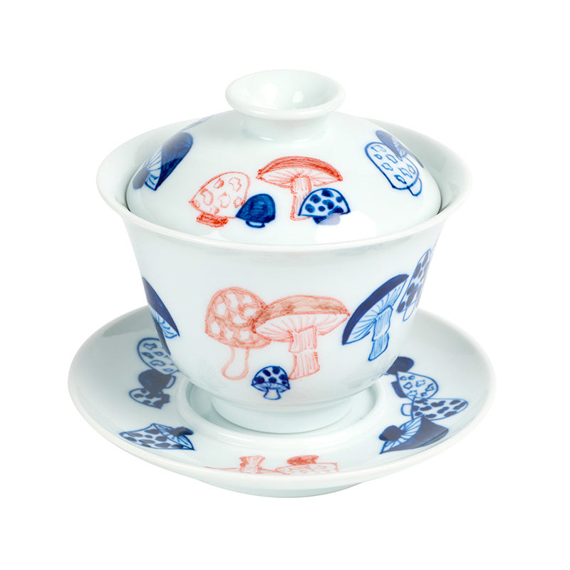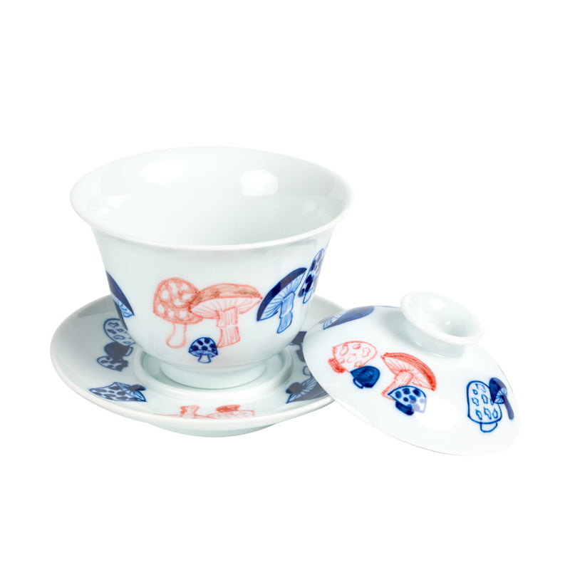 A gaiwan with a blue and red mushroom patch design.