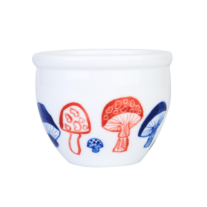 A shroom teacup with a blue and red mushroom patch design.
