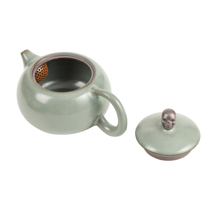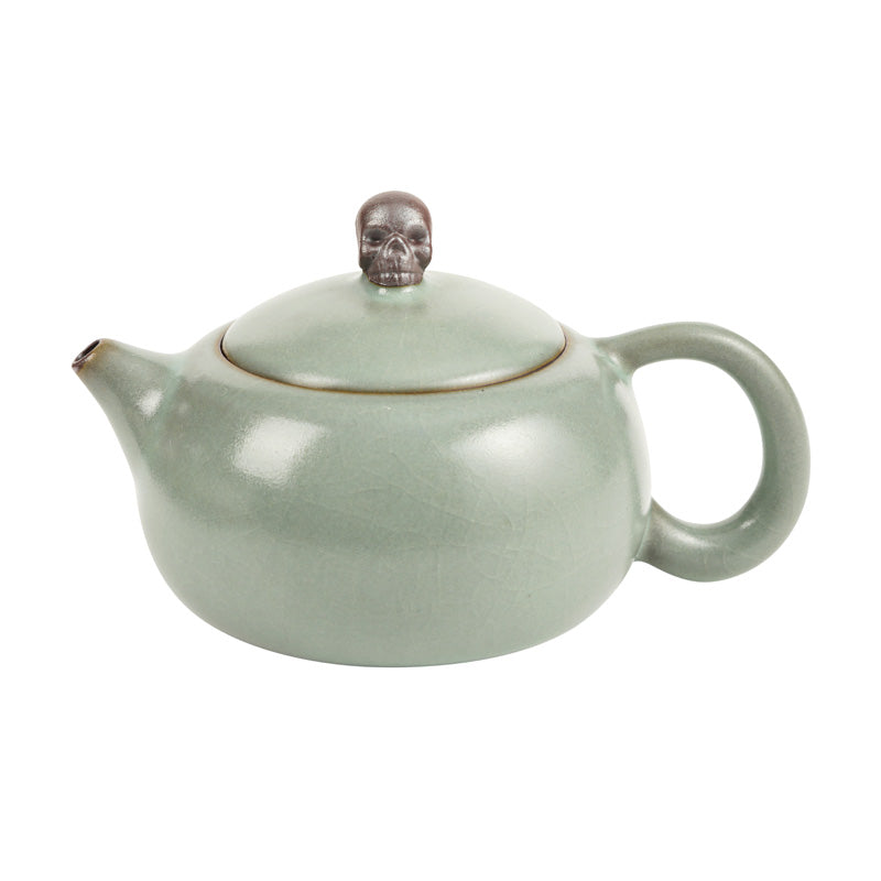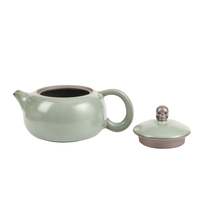 A glazed jade xishi style ruyao teapot with a skull on the lid. This glaze is crackled and might leave some crazed pattern with use, though it seems to absorb less than our previous run of white ruyao.