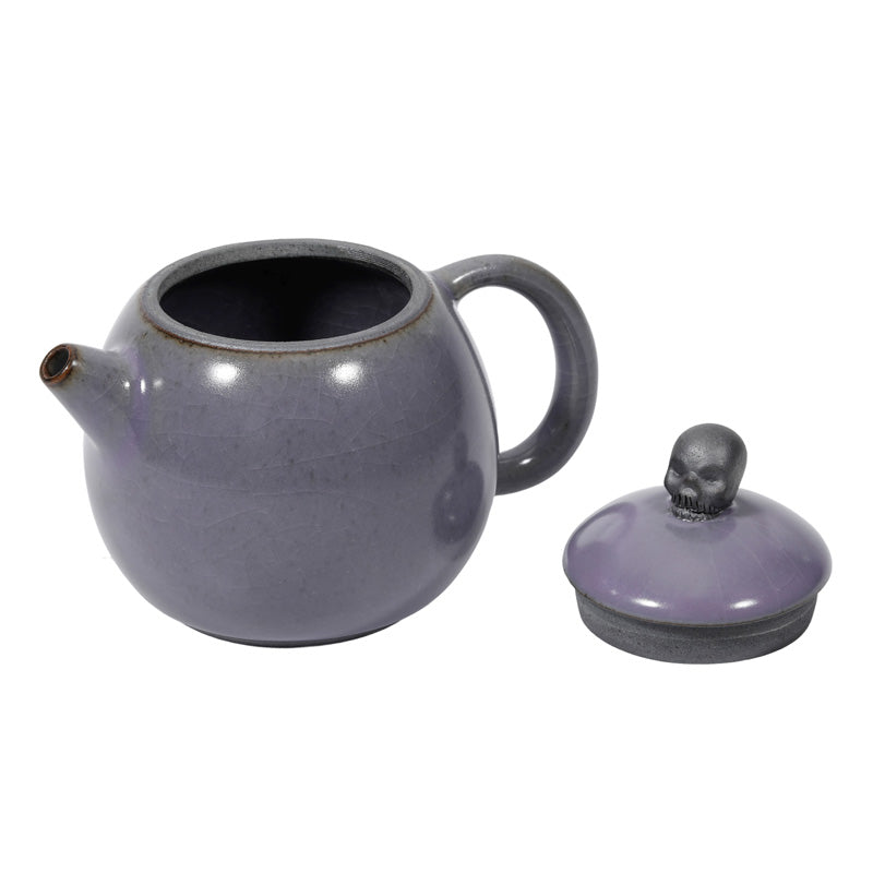 A glazed purple ruyao dragon egg shaped teapot with a skull on the lid. This glaze will craze, leaving a crackled history of the teas that you drink.
