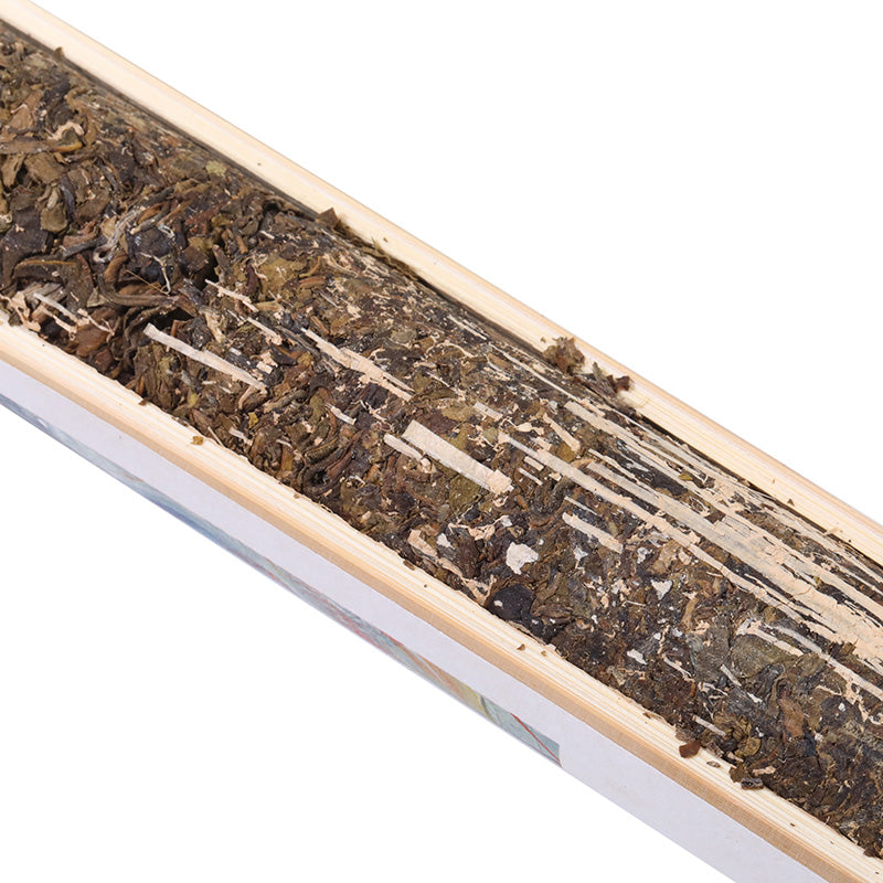 A hand roasted bamboo raw Puer blend made from high end huangpian (the oldest, largest leaves in Puer production). The bamboo processing of this tea means that the leaves are broken up, so the tea will brew faster and stronger due to the increased surface area.