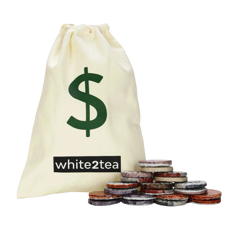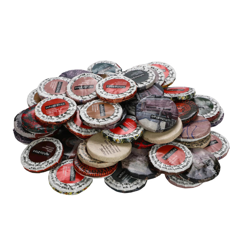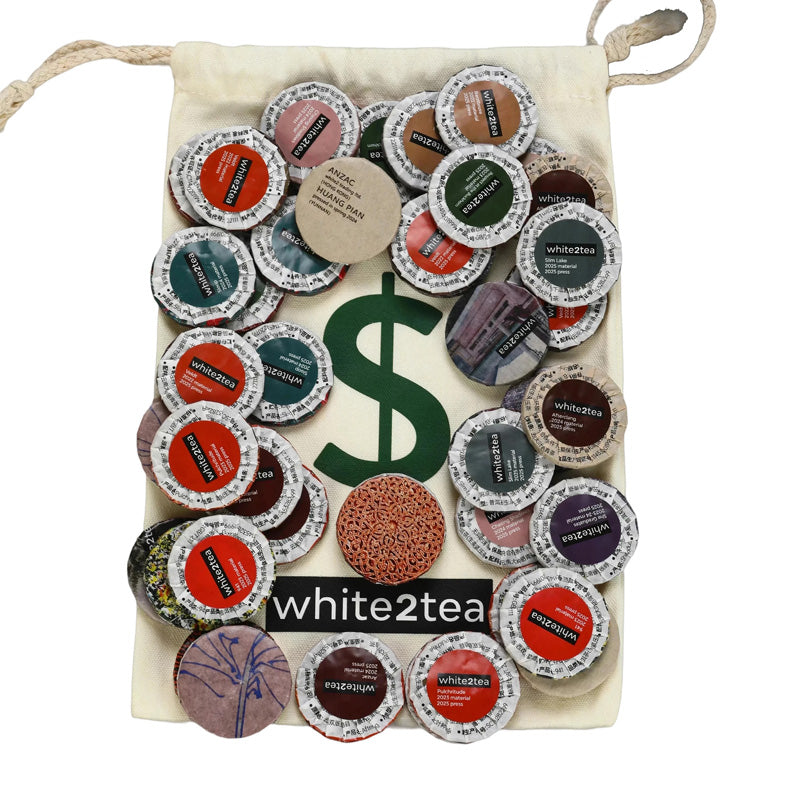 Each bag will contain ~455g of tea (~one pound), with a random mix of sheng Puer mini coins from white2tea with more than ten blends in total, including some of our regular tea blends and several special pressings for the loot bag. We really went for it on this one, don't miss it.